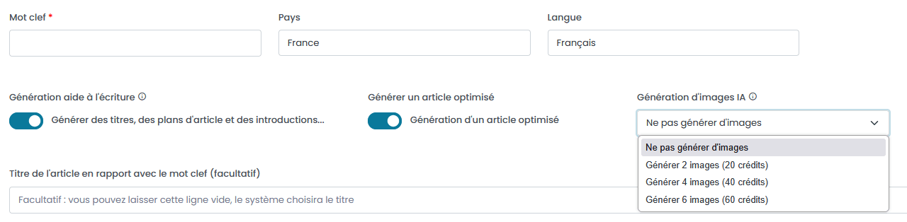 - Génération d'images IA : Vous pouvez choisir de générer 0, 2, 4 ou 6 images par intelligence artificielle en rapport avec votre article.