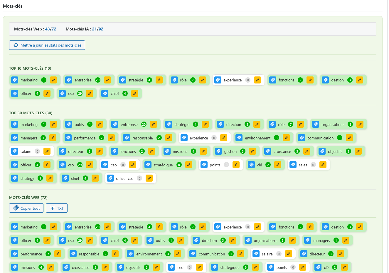 Le chiffre entouré en vert correspond au nombre de fois que le mot clef apparait dans le texte.