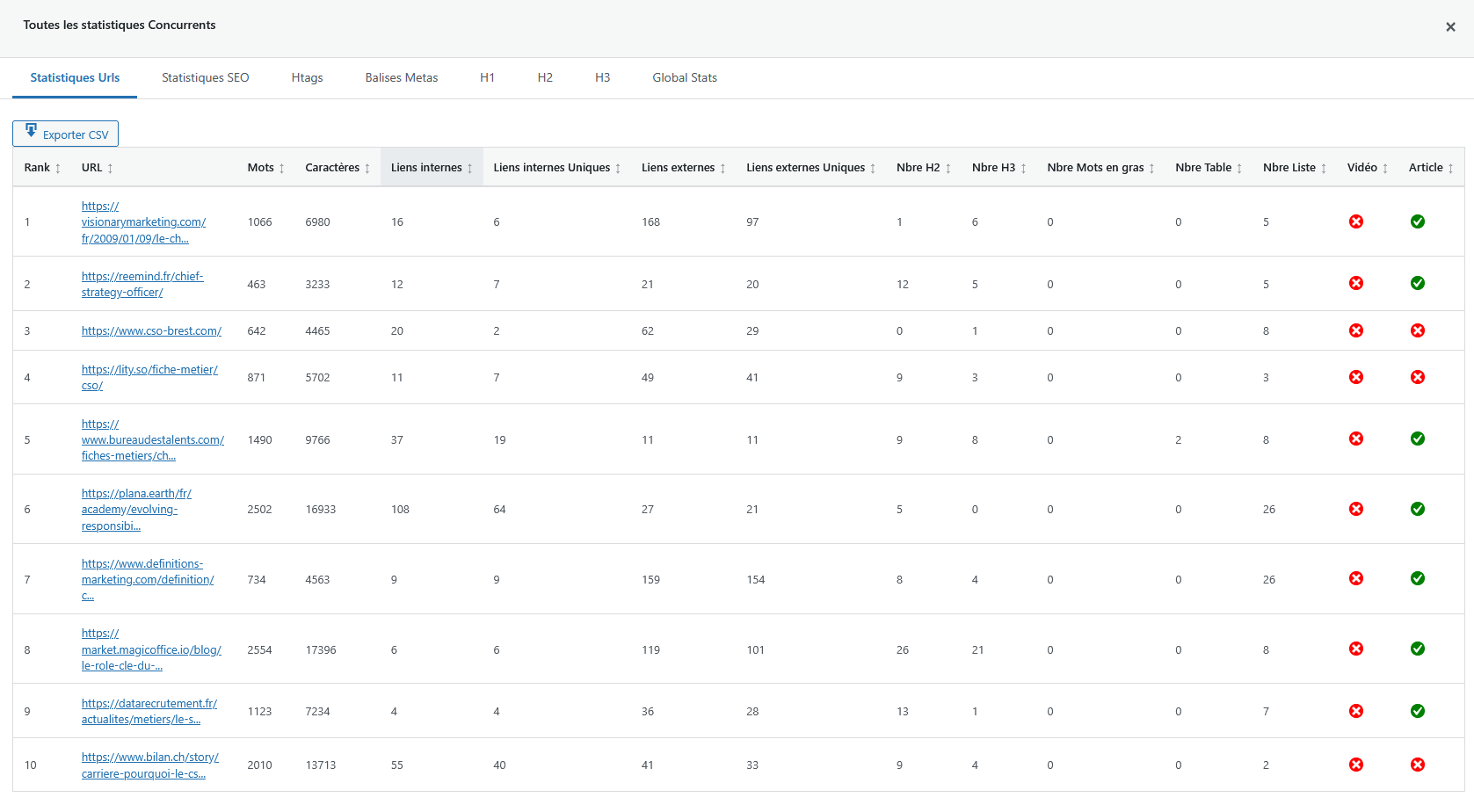 - Présence dans le texte, en gras, dans les balises Htags, dans la Meta Titre, etc. (uniquement sur l'application Articlum app.articlum.com)