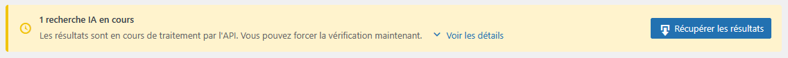 Le processus devrait prendre une minute par 50 pages environ. Vous pouvez recharger la page au bout de quelques minutes pour voir le résultat. Si cela ne fonctionne pas, cliquez sur Récupérer les résultats puis recharger la page.