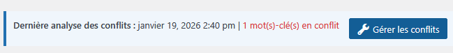 Un conflit se produit quand le même mot-clé est utilisé par plusieurs entrées. Le bouton "Analyser les conflits" détecte ces doublons.
