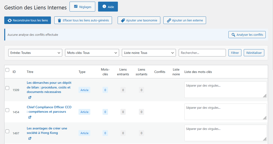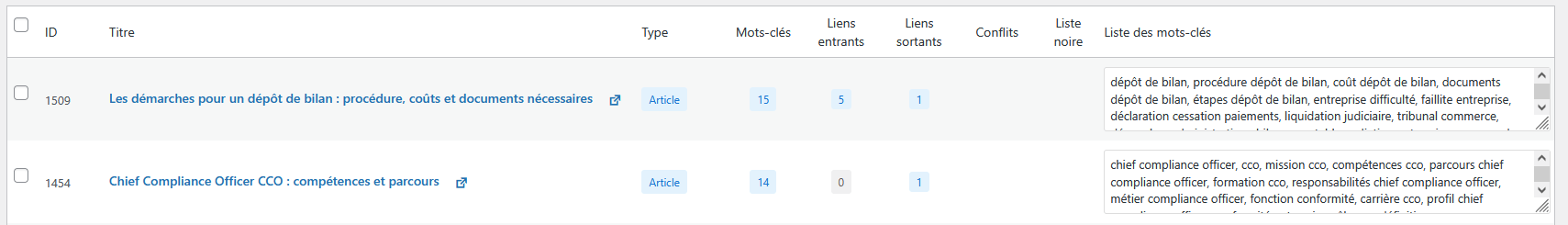 Le tableau affiche toutes vos entrées (articles, pages, taxonomies, liens externes).