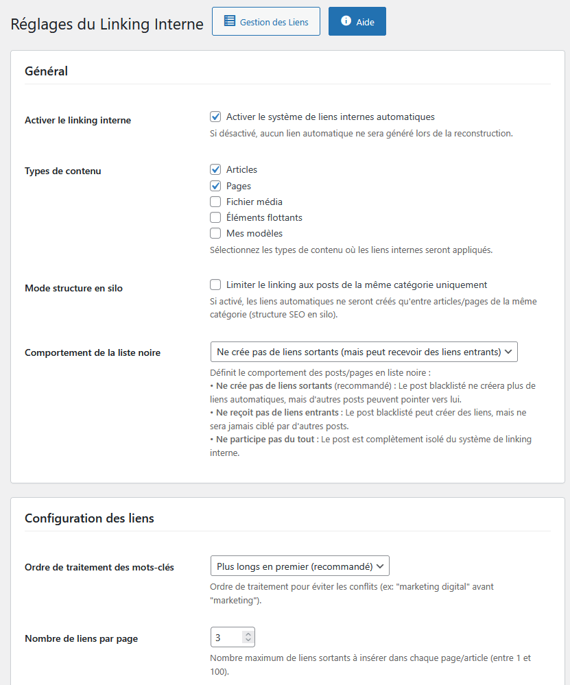 Cette page permet de gérer le système de liens internes automatiques. Le plugin crée des liens entre vos contenus en fonction de mots-clés que vous définissez.